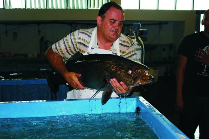 Fig. 1 Transfer of a sedated Dusky Kob breeder during the spawning induction process.