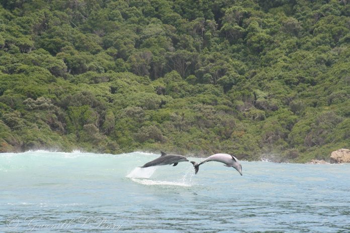 Two Bottlenose dolphins leap out the back of a wave at Keurbooms near Plettenberg Bay. Photo: Gwen Penry