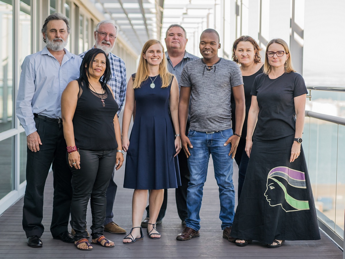 Archive photo of the orignal defendants in defamation suits brought by an Australian mining company (from left to right): environmental lawyer Cormac Cullinan; Lutzville community activist Davine Cloete; social worker, author and commentator John GI Clarke; former Centre for Environmental Rights (CER) attorney Tracey Davies; Riaan Oberholzer; Wild Coast community activist Mzamo Dlamini; Tossie Beukes and former CER attorney Christine Reddell. The claims against Beukes, a journalist, and Oberholzer, her publisher, were dropped. Source: GroundUp