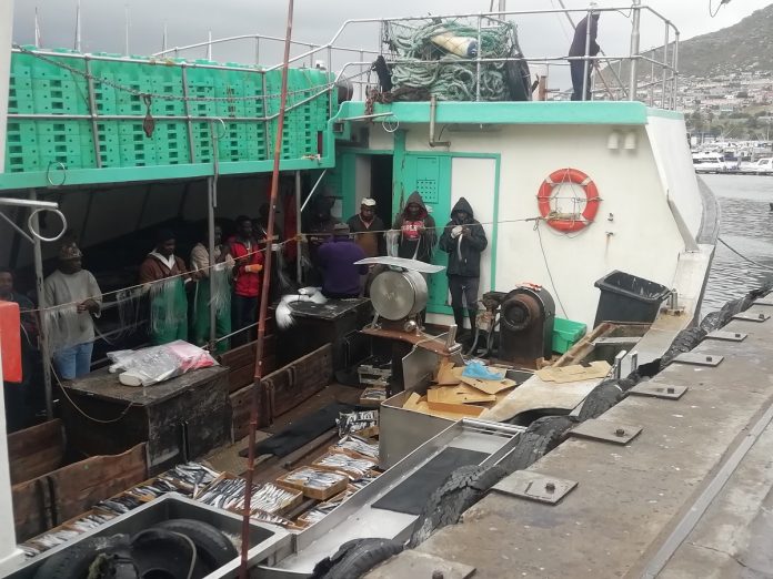 The crew of a longline fishing vessel berthed in Hout Bay prepares the baited lines used to catch hake via the longline method. Photo supplied