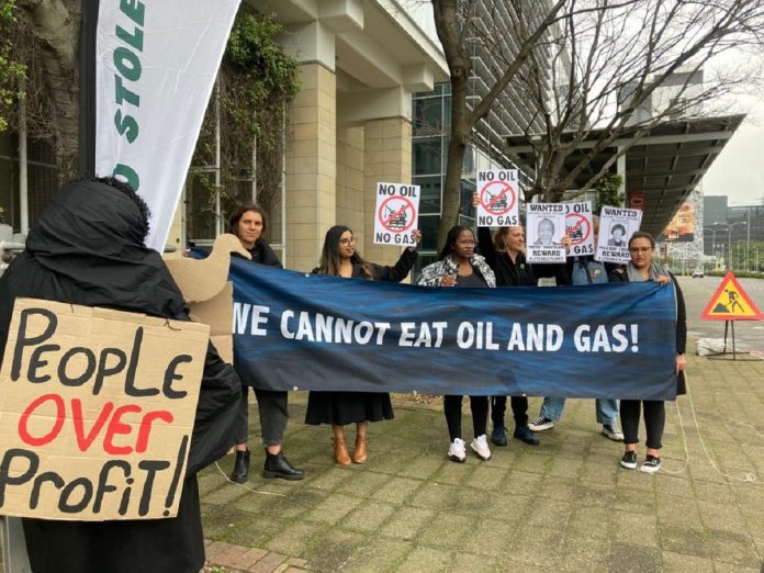 Protest action outside the Cape Town International Convention Centre last year where the fishing and petroleum industries were thrashing out their issues related to oil and gas exploration. Photo: Twitter